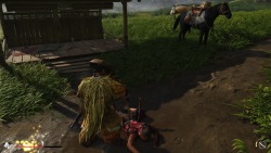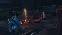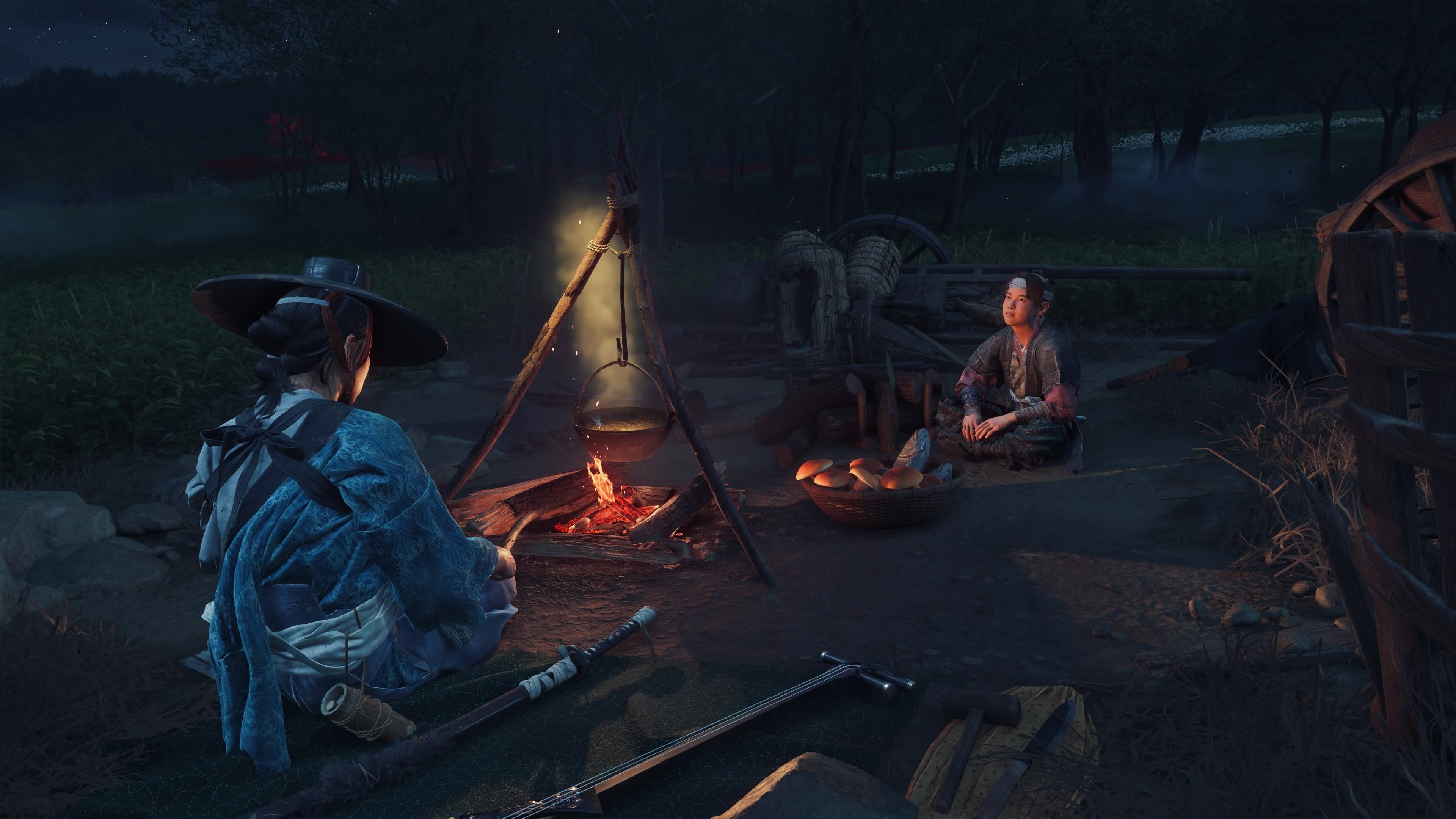 allume un feu, on cuisine en interagissant avec la DualSense, et parfois, un voyageur de passage vient échanger, livrer des informations ou marchander. Ces moments de calme permettent aussi de jouer une mélodie au shamisen avant de se reposer, offrant une parenthèse contemplative dans une aventure où chaque geste compte.